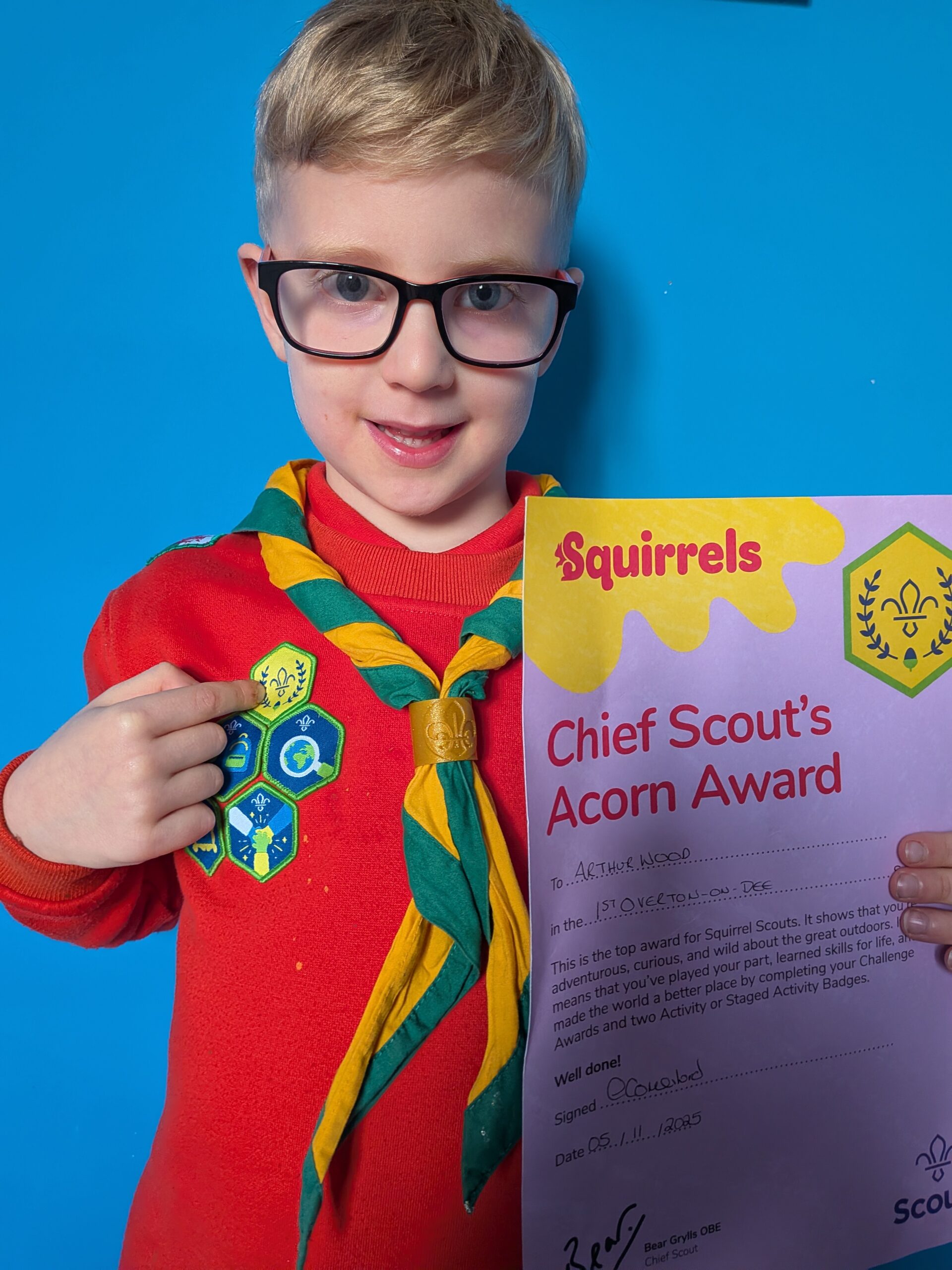 Arthur will be leaving Squirrels this week and moving up to Beavers, and he has been awarded his ‘Chief Scout Acorn Award’ having completed all the requirements (including the 4 challenge badges underneath it). He is only the 2nd Squirrel in the Drey to receive it. Well done Arthur!