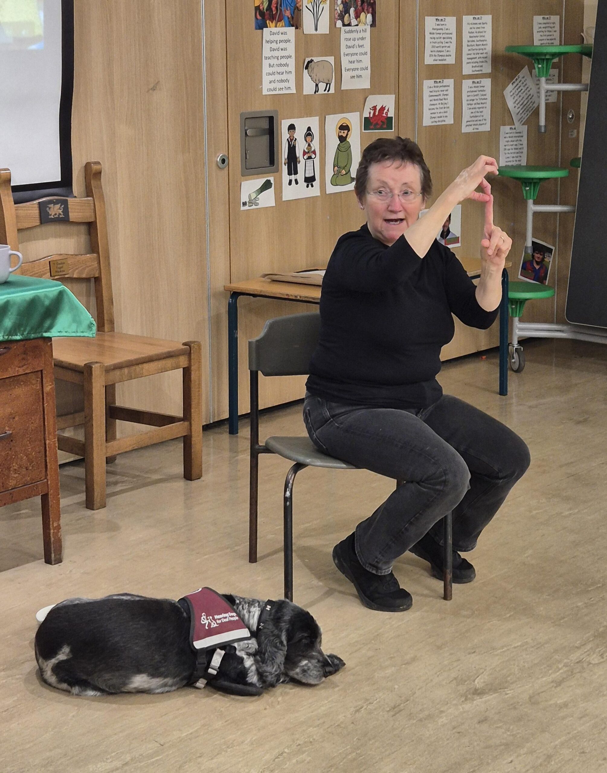 We had our first BSL lesson with Miss Angela, Miss Debbie and Dasher. We learned the Welsh and English alphabet. We asked each other our names and were able to sign the reply. We loved cuddles with Dasher too.