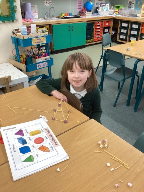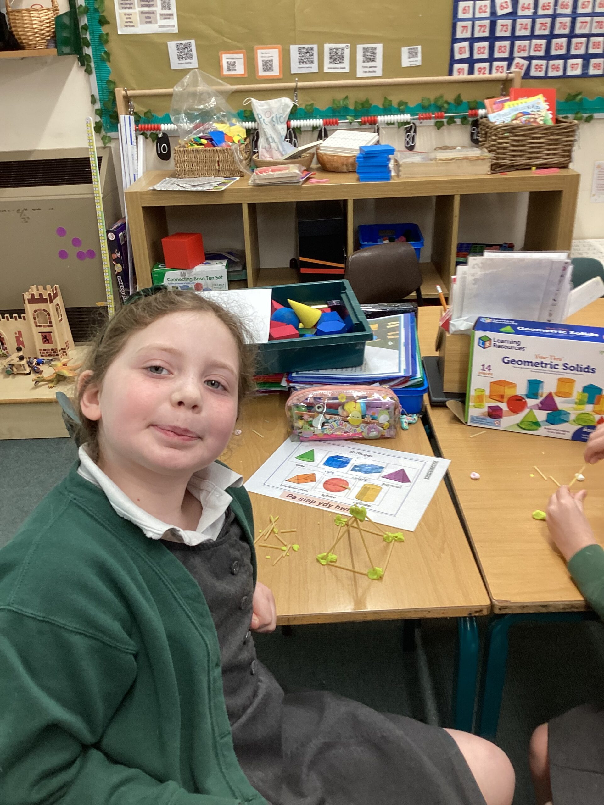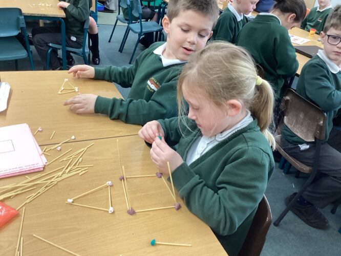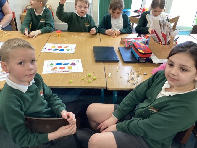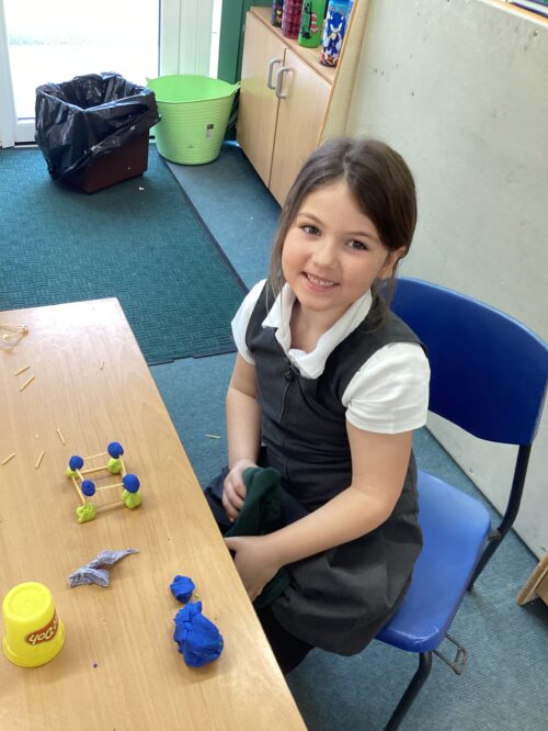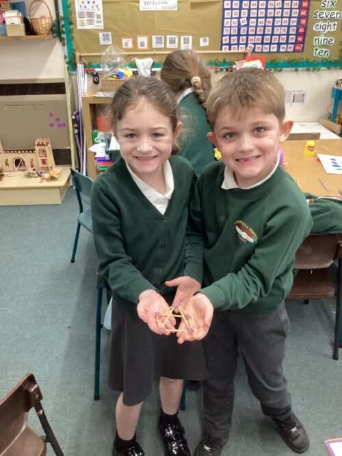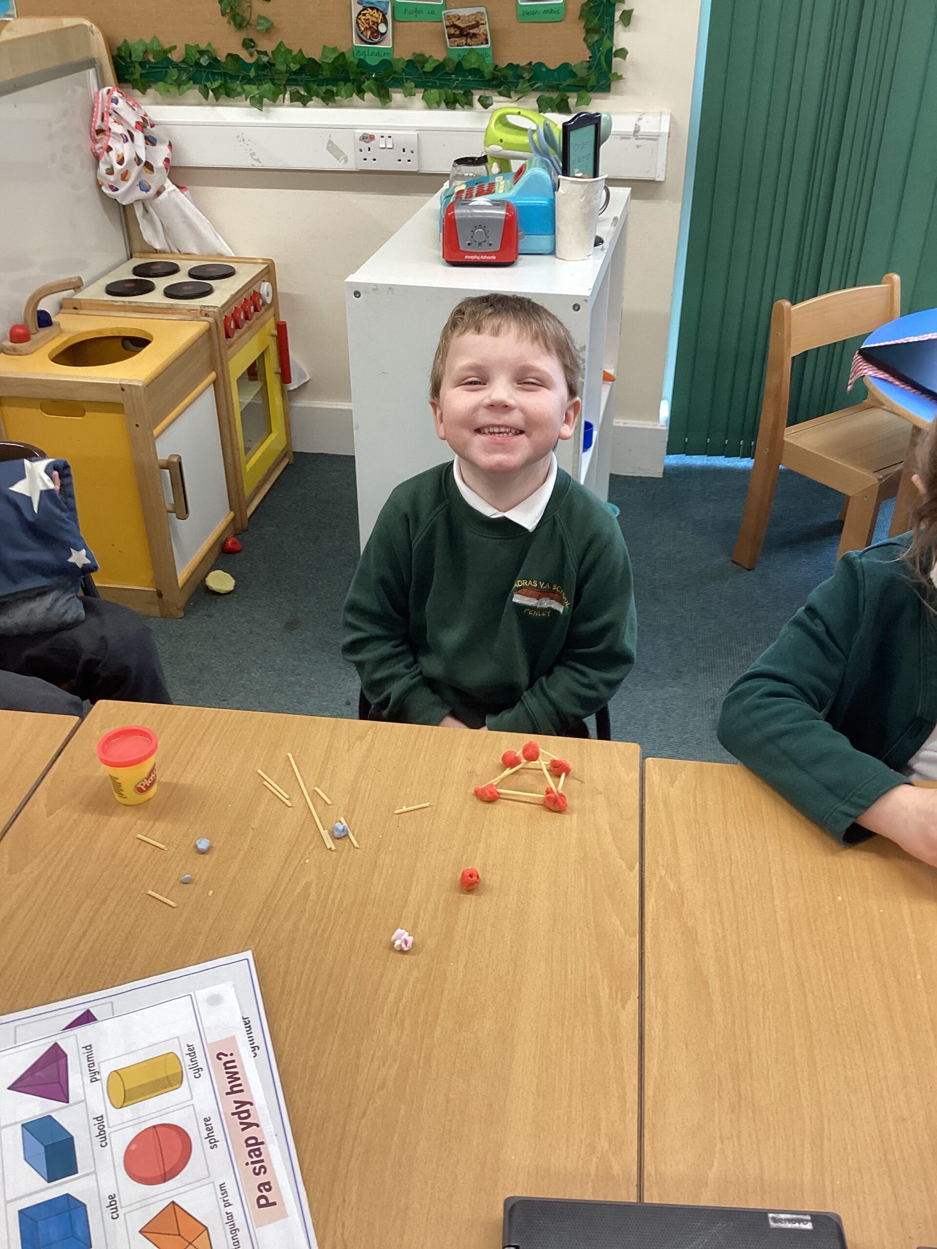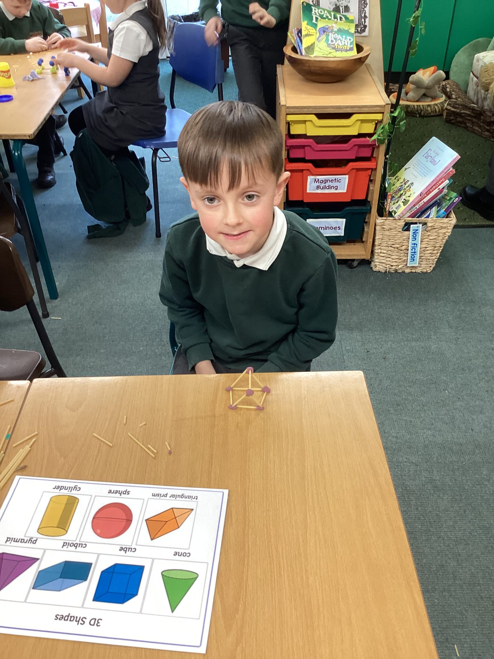 We have been naming and looking at the properties of 3D shapes. We have been busy making different shapes using spaghetti and playdough.
