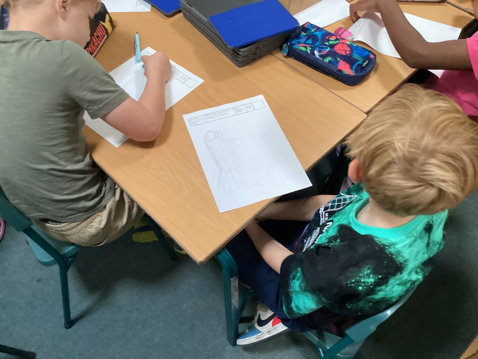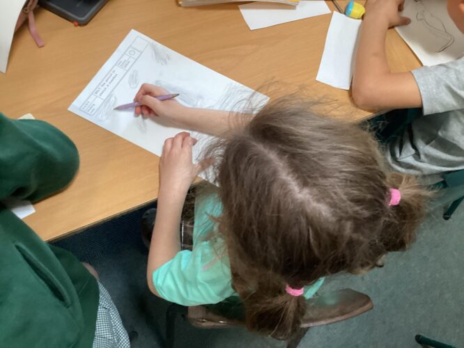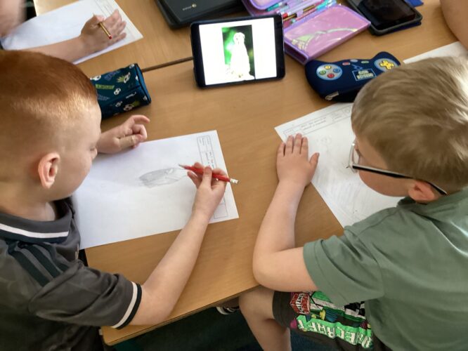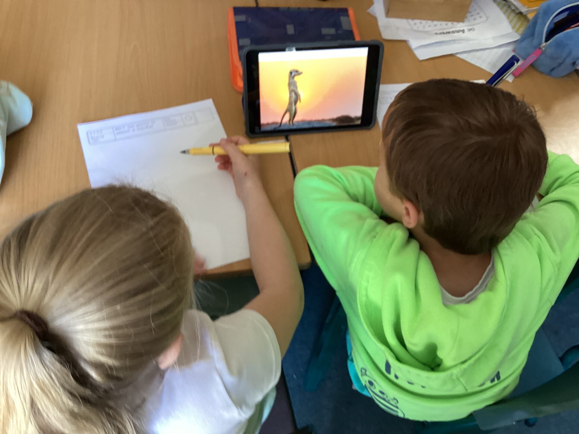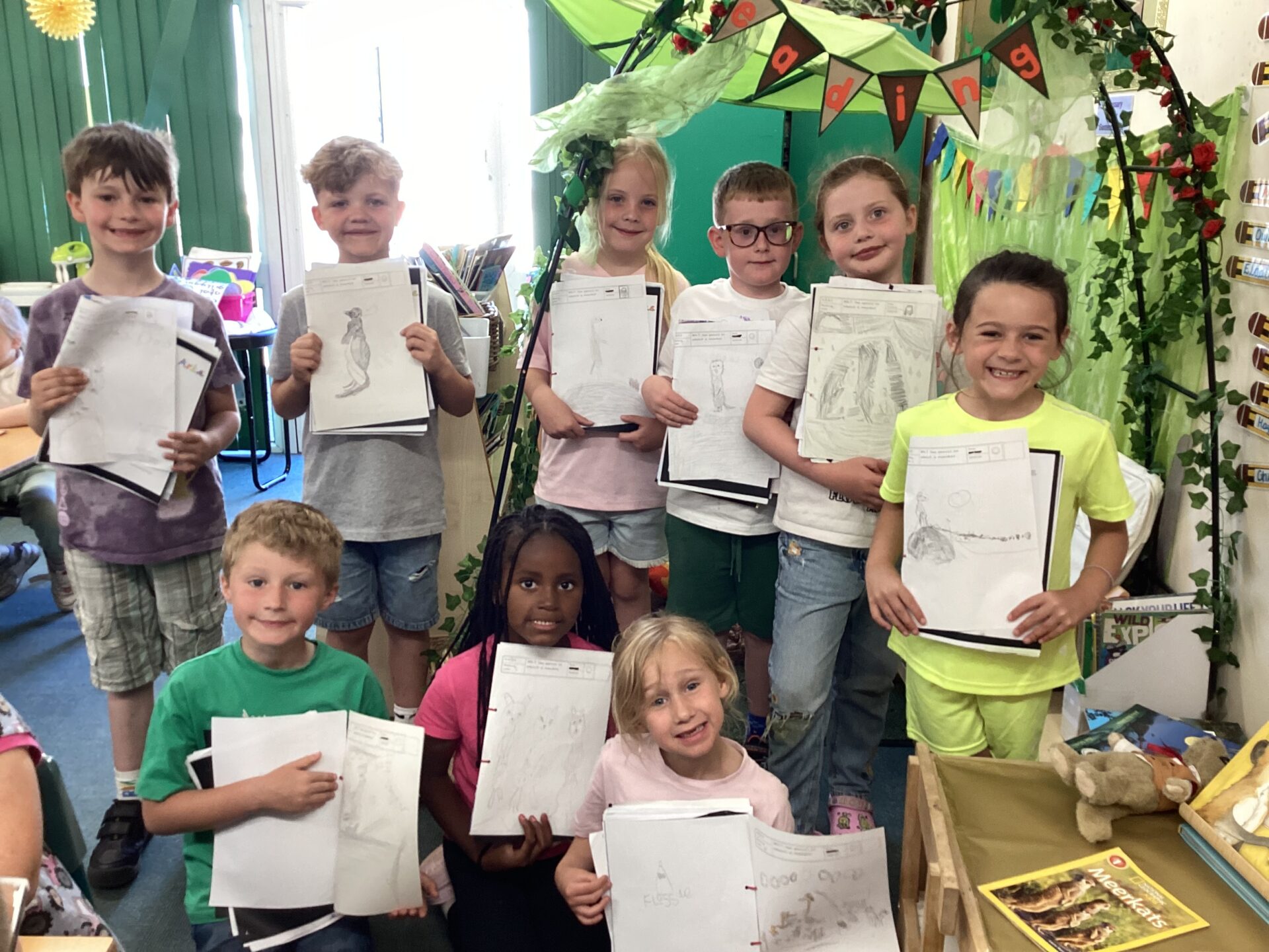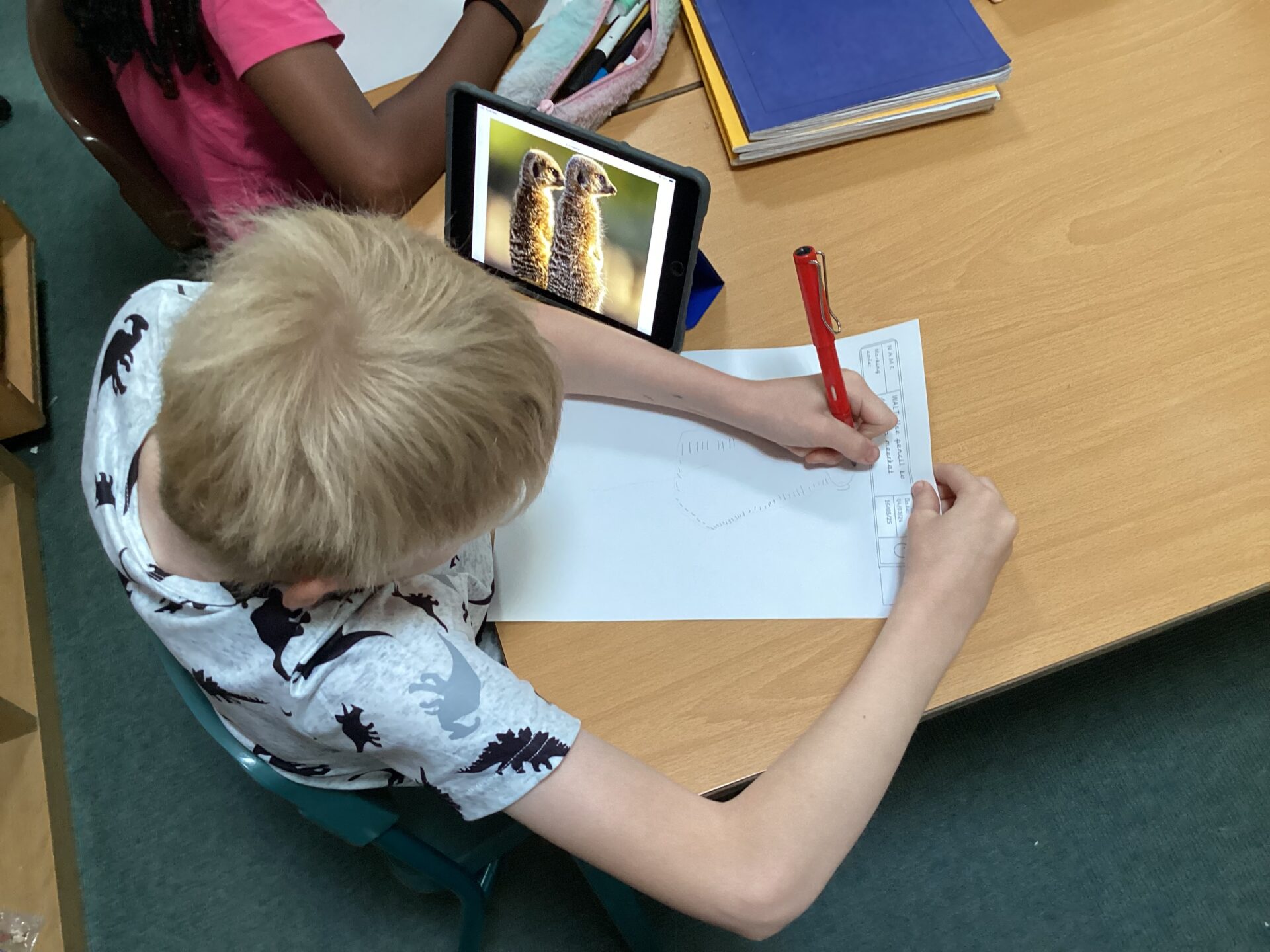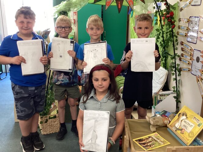 Class 2: Developing our sketching skills Fri, 16th May 2025 We have been practising sketching. We looked at how to use light strokes and plan out the shape first, then to add more and more details. We chose our favourite picture and then sketched the meerkat. We are very proud of our finished sketches.