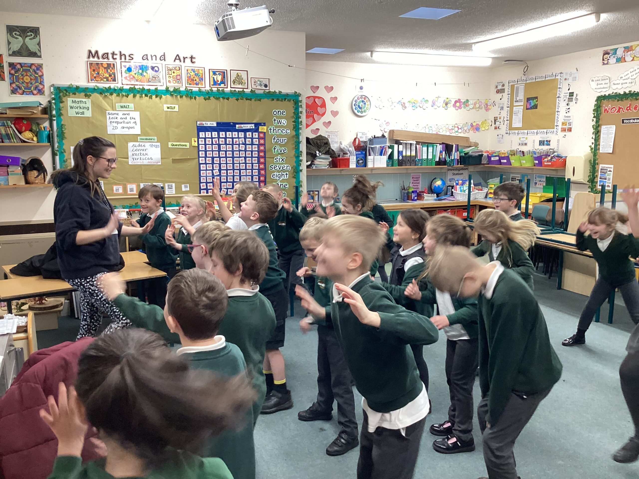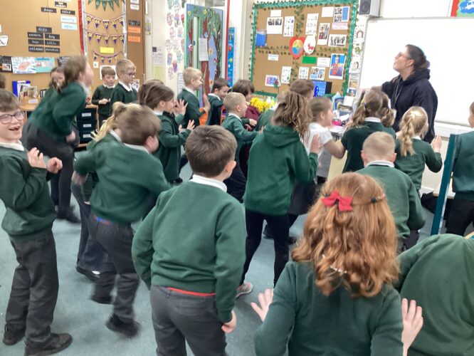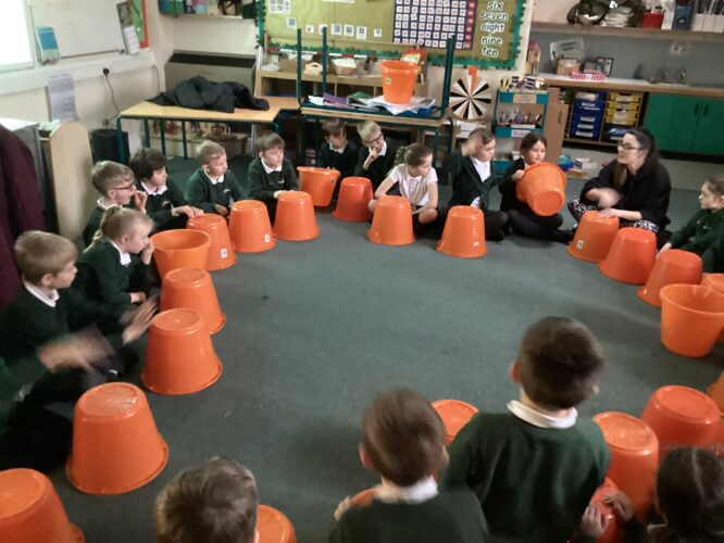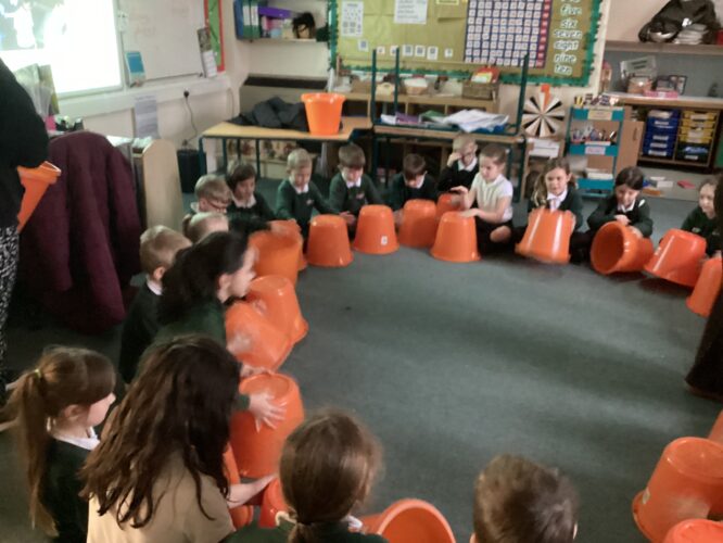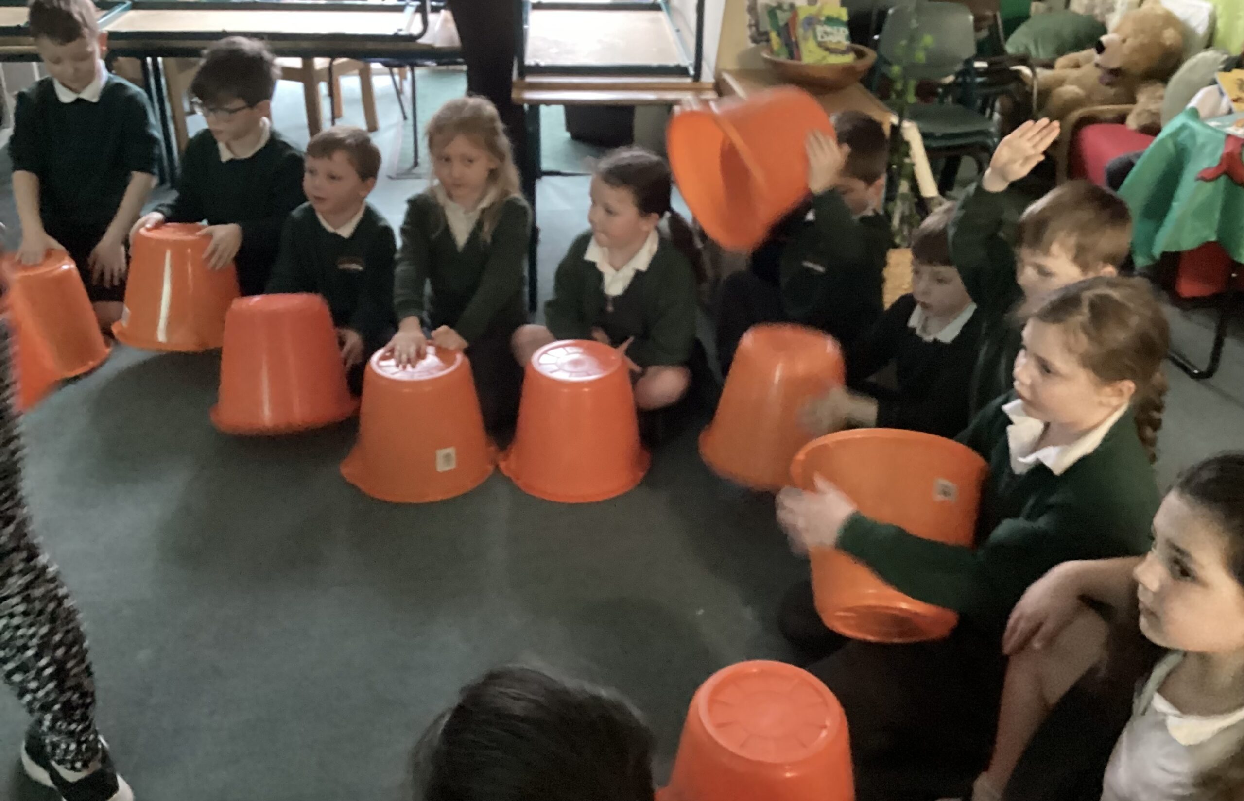 Class 2: First Music Bucket Drums Fri, 13th Feb 2026 We had so much fun today with Katie from First Music. We did lots of activities on rhythm with the bucket drums.