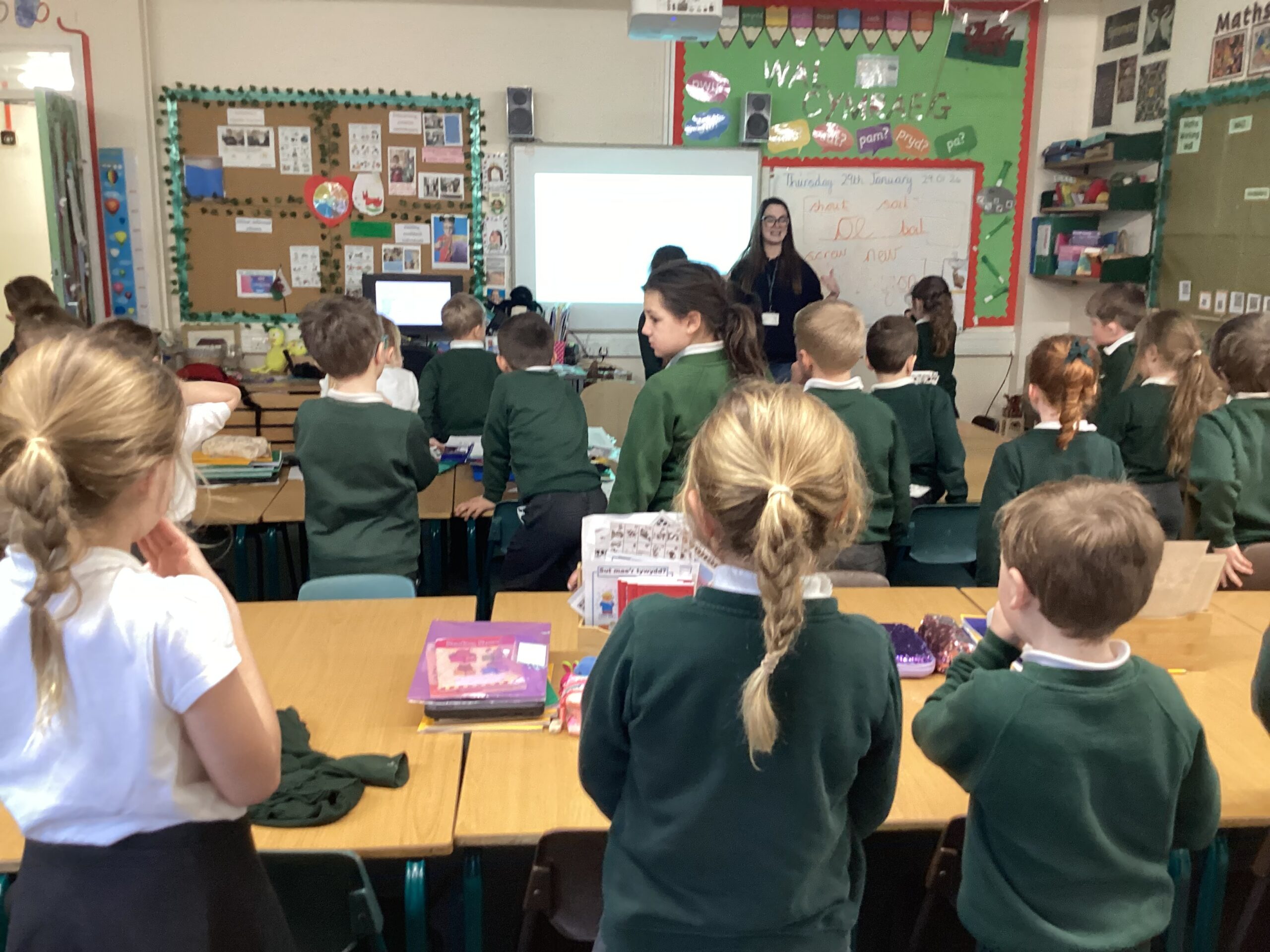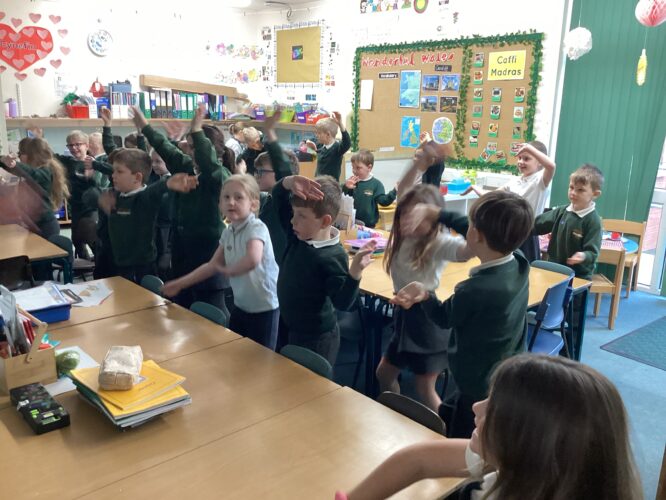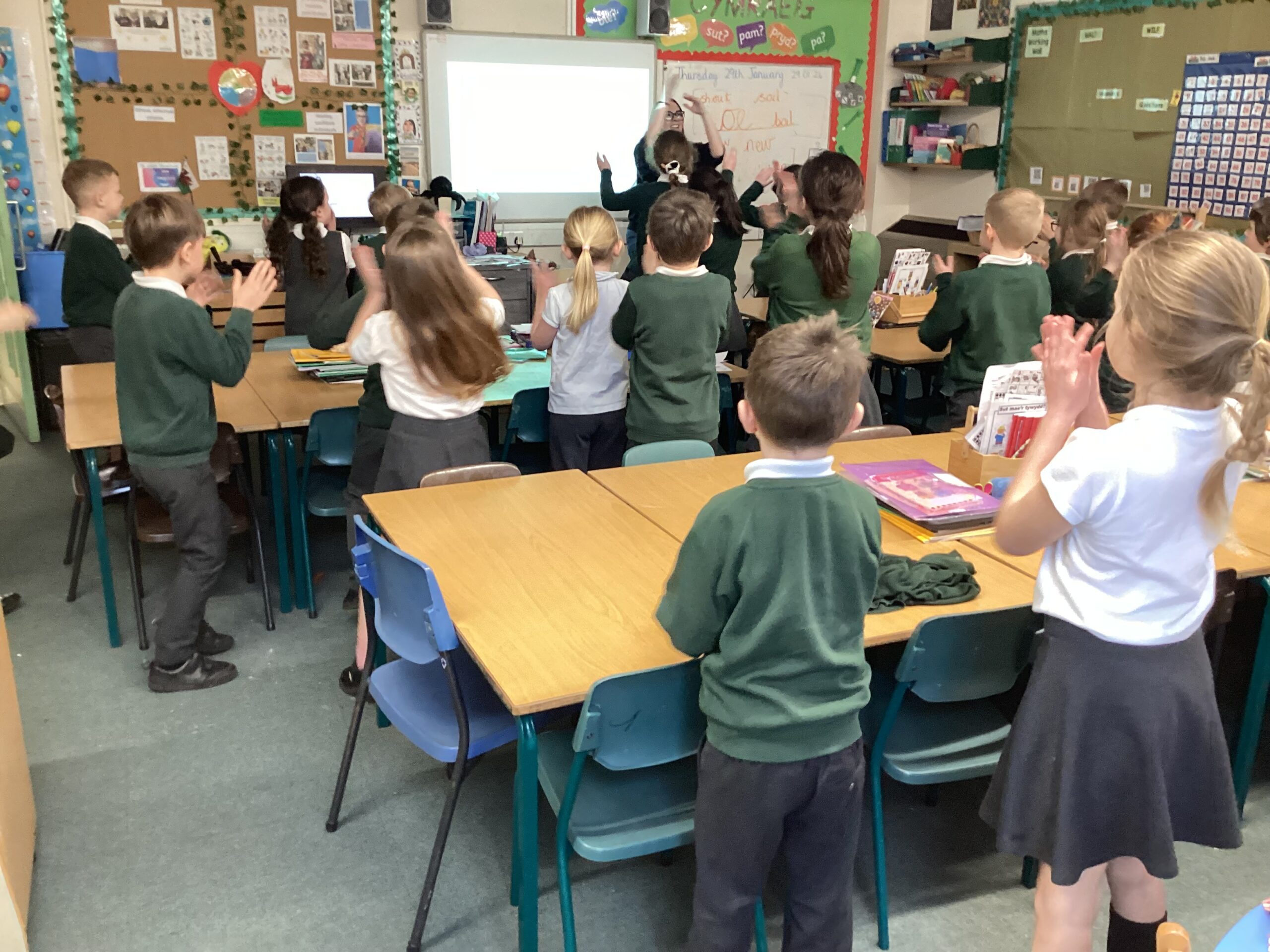 Class 2: First Music Fri, 30th Jan 2026 We had lots of fun today with Katie. We sang and clapped along to the rhythm of songs. We had to make up new actions, too.