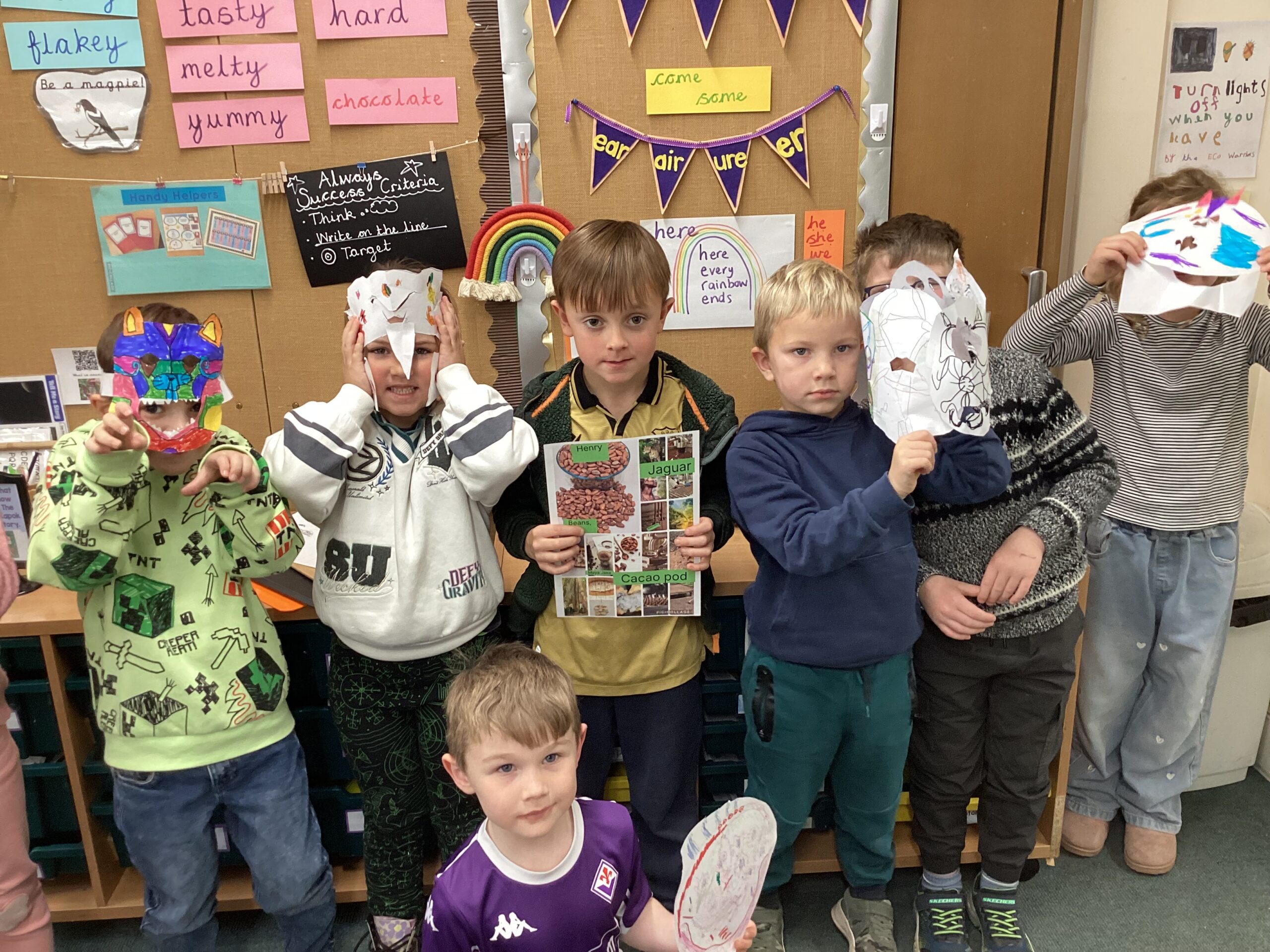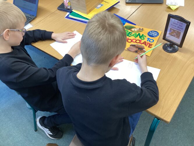 We have been very busy today. We having been showing what we know about our chocolate topic so far. Today we had children choosing to make Aztec masks, design chocolate bars, some built a Mayan temple in the Lego. Some children decided to make a presentation showing information about cacao trees and others drew and labelled pictures or made a PicCollage with pictures and labels. We have some very creative children!