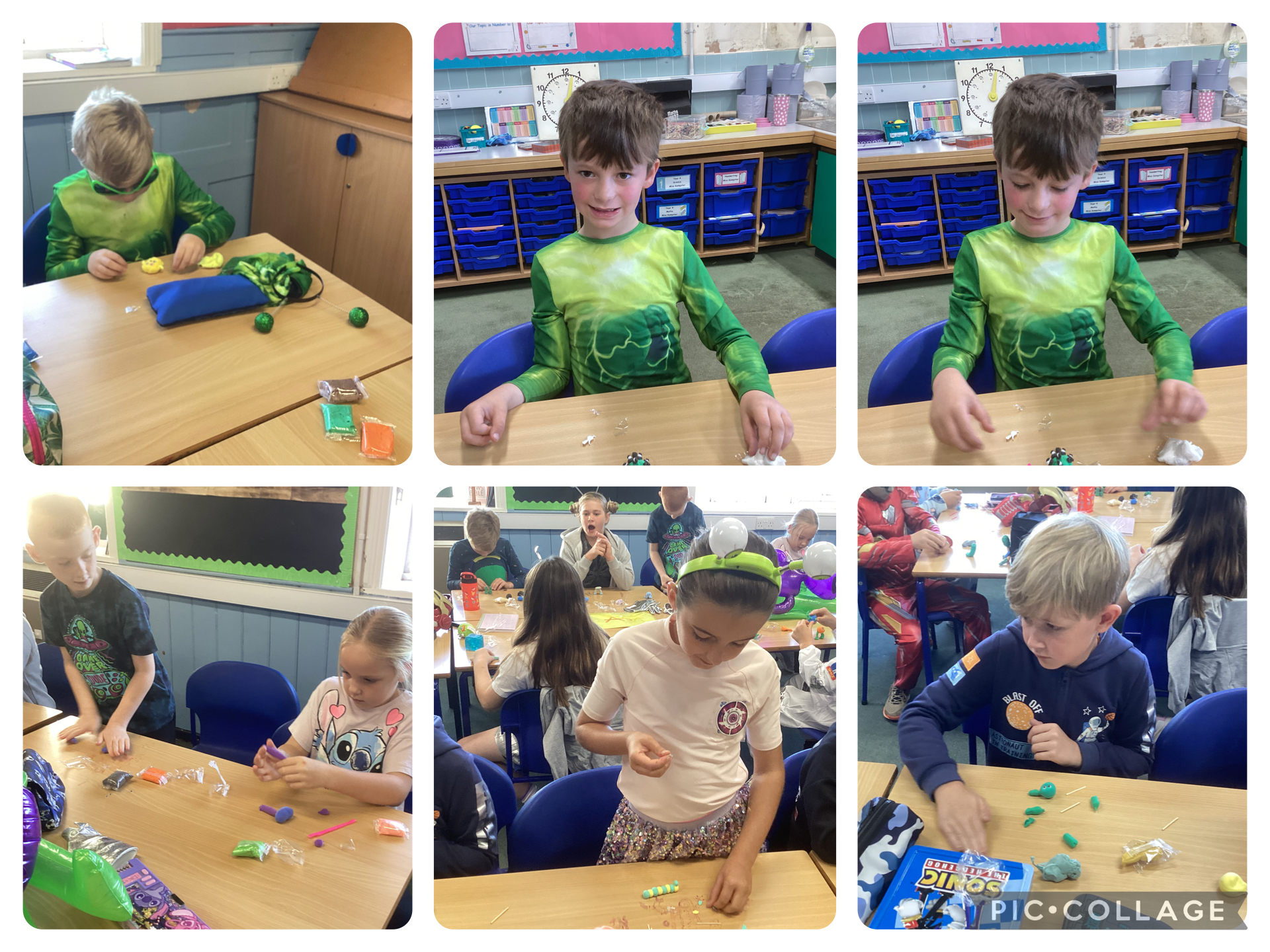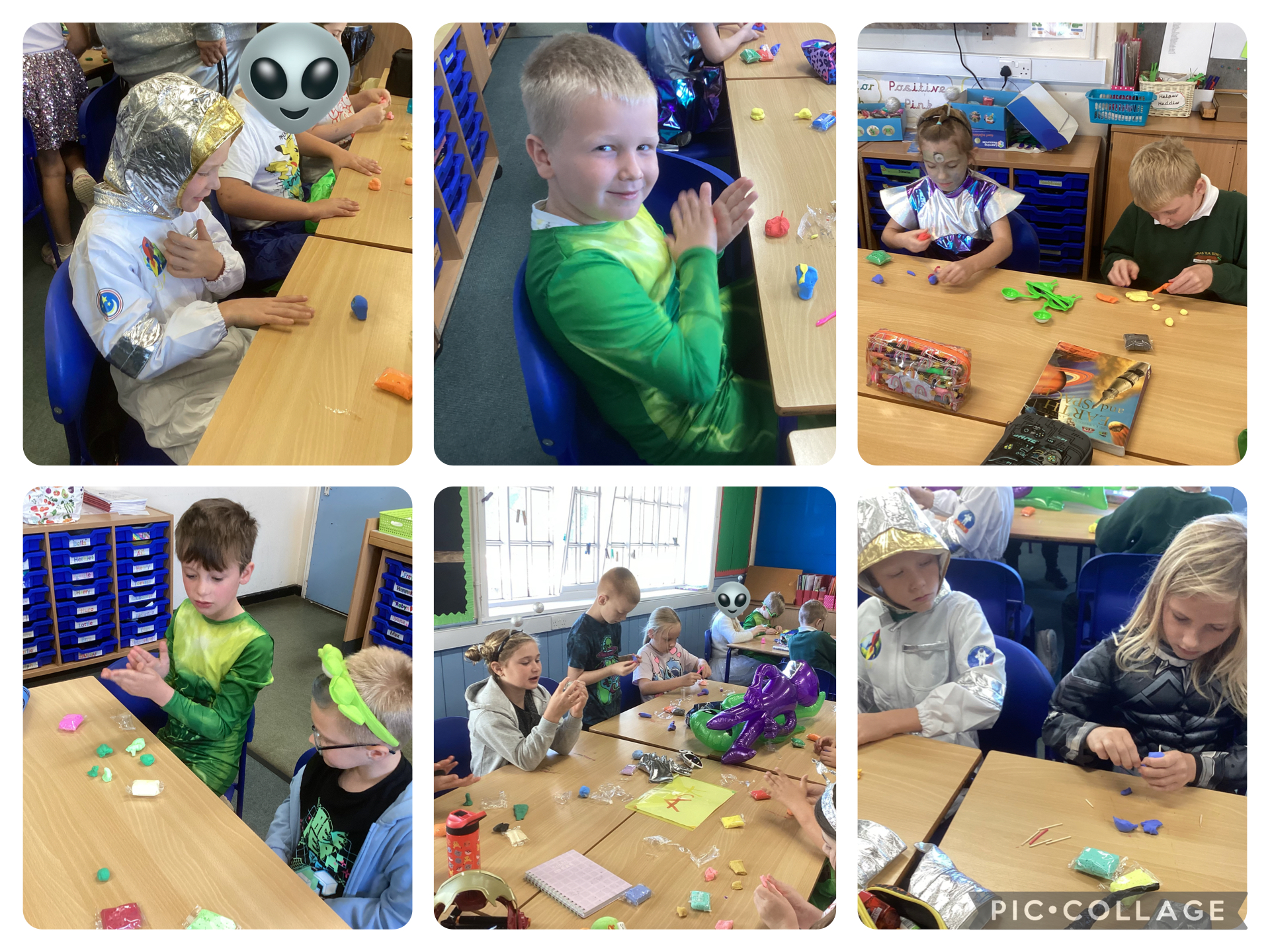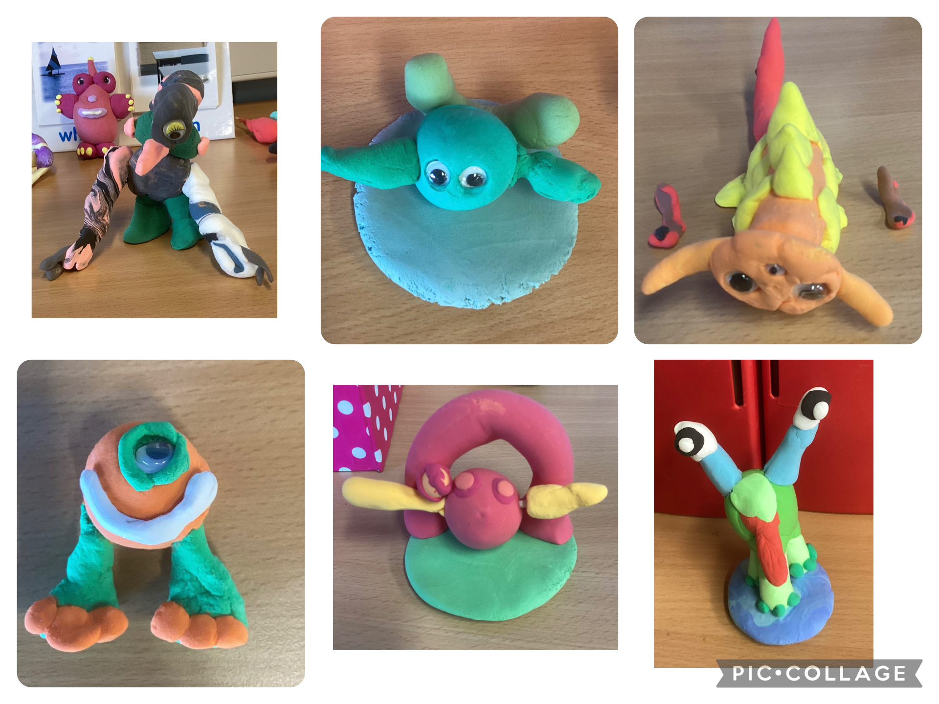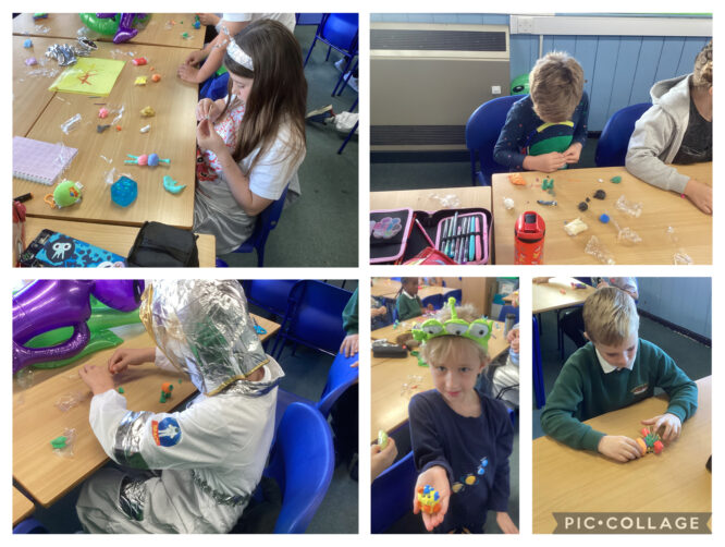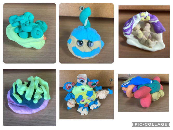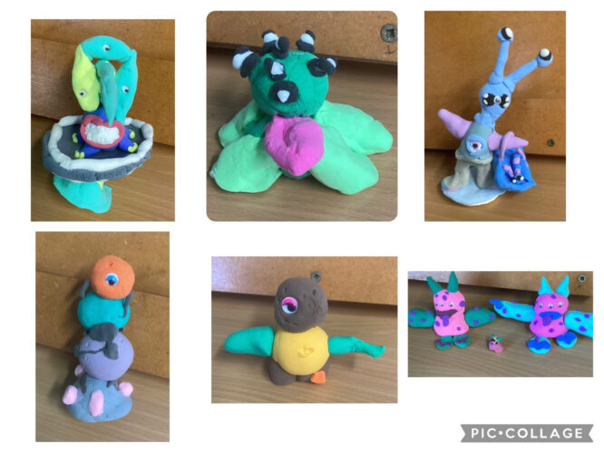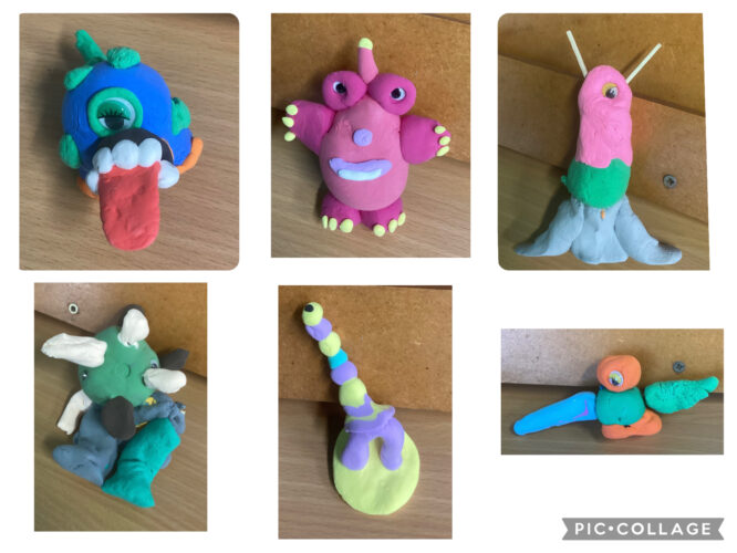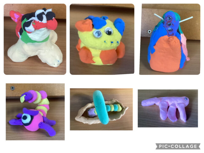 Our first task was to create aliens using clay. We watched some videos that gave us great ideas and showed us how to use sticks to keep the different body parts connected. We really love our aliens and are very proud of them. We hope you like them too!