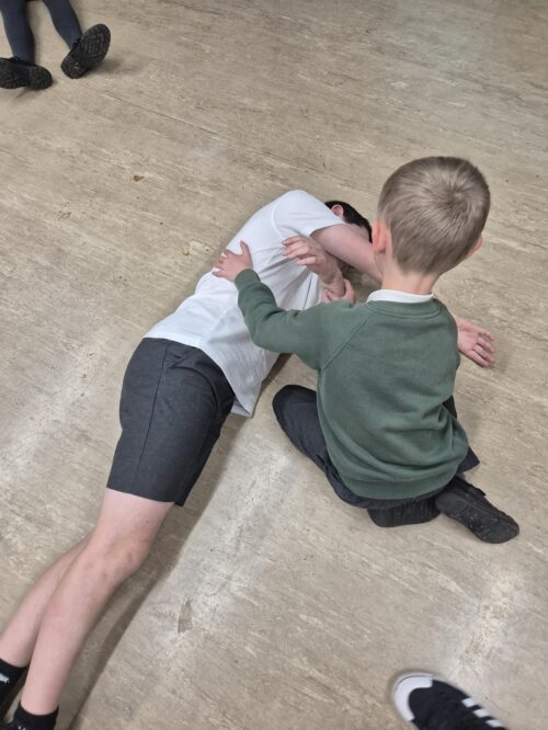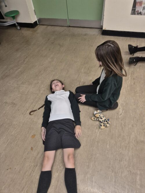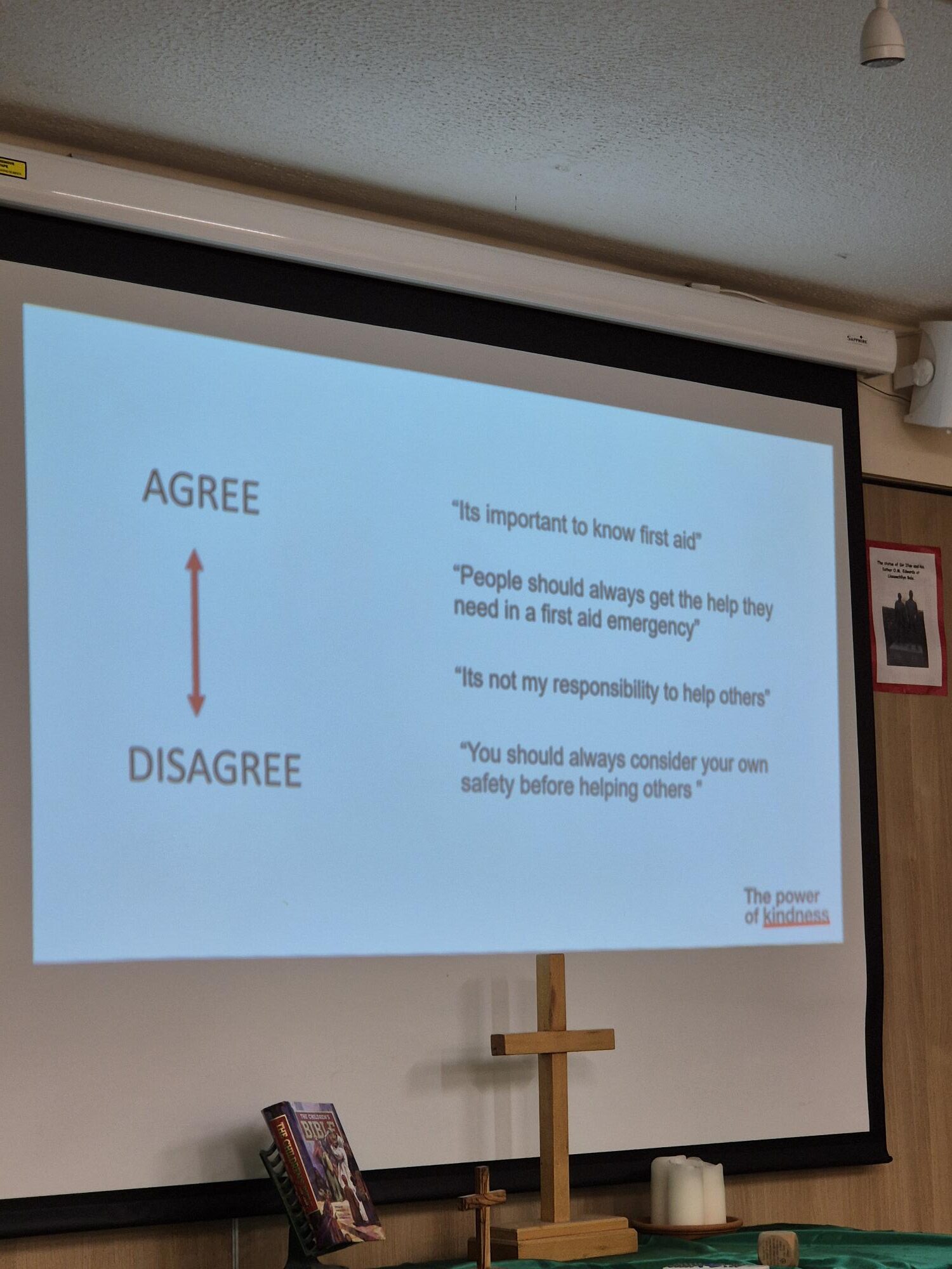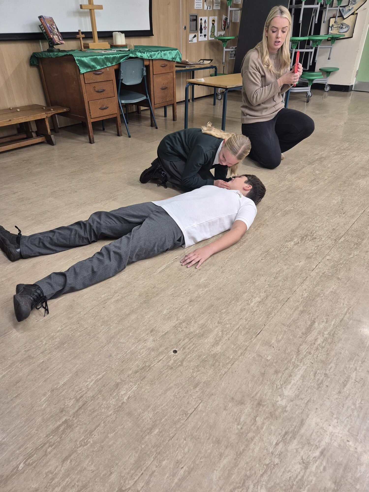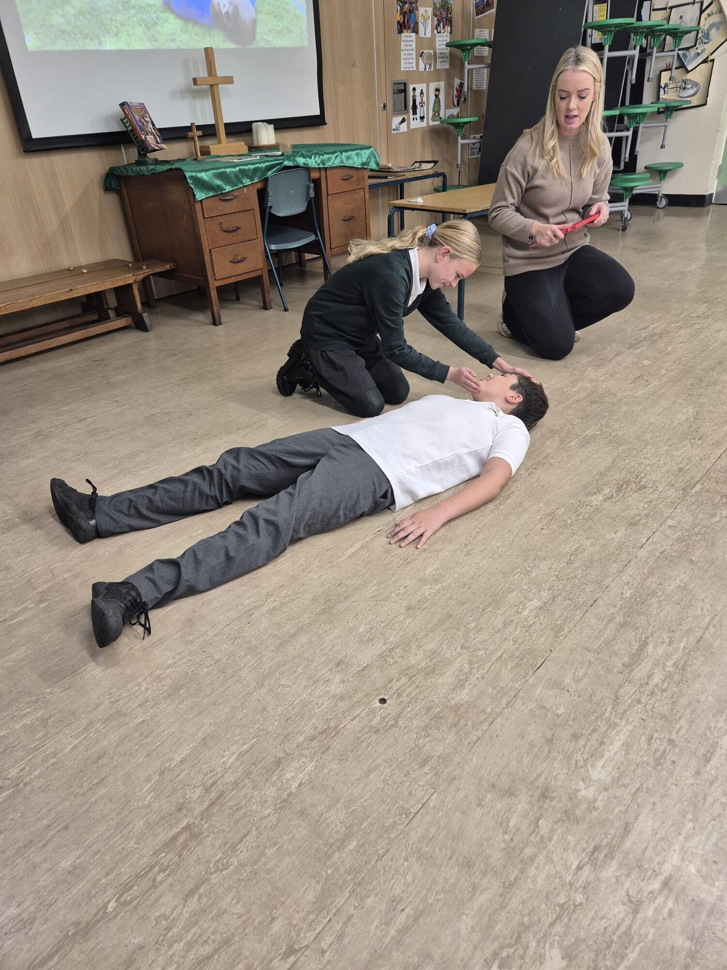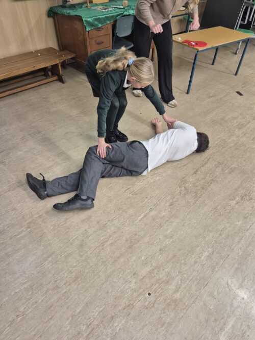 Today the Red Cross visited us and delivered Emergency First Aid training. This is a lovely link to our Christan value of Koinonia – being part of a community, being able to help each other in a community. We learned that we must not endanger ourselves when administering first aid, we must think about stranger danger or any environmental danger around the casualty. We learned how to check for breathing, put patients in the recovery position and to ring for help.