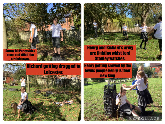 We acted out the Battle of Bosworth in class to learn about how the Tudor family came to the throne. Each group had to tell the story in less than 10 freeze frames. They then edited the pictures and added text. We had some fun trying to express the emotions of the various characters involved.
