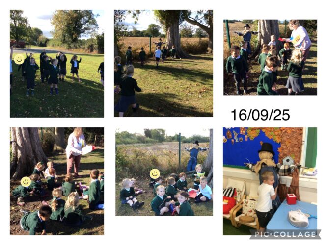 We were looking for different coloured leaves, when suddenly, we saw a scarecrow by the fence. We ran over to investigate.