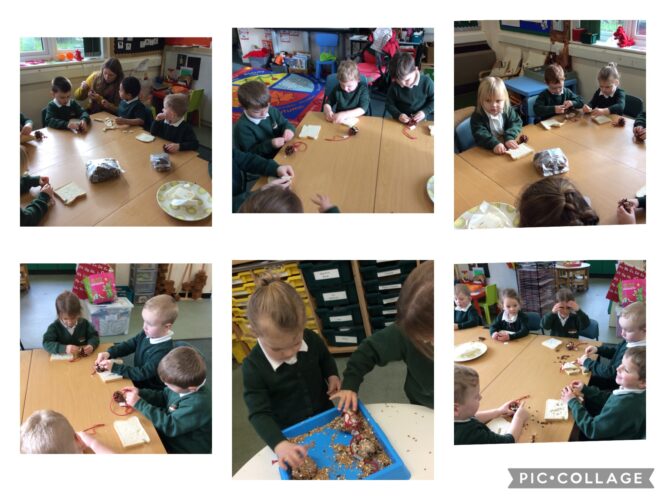 We made bird feeders by putting bread and dried fruit into pine cones. We put lard all the over the cone and rolled it bird seed.