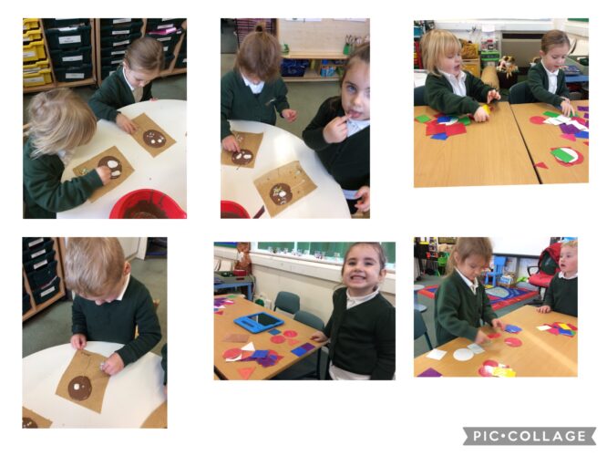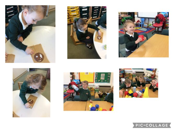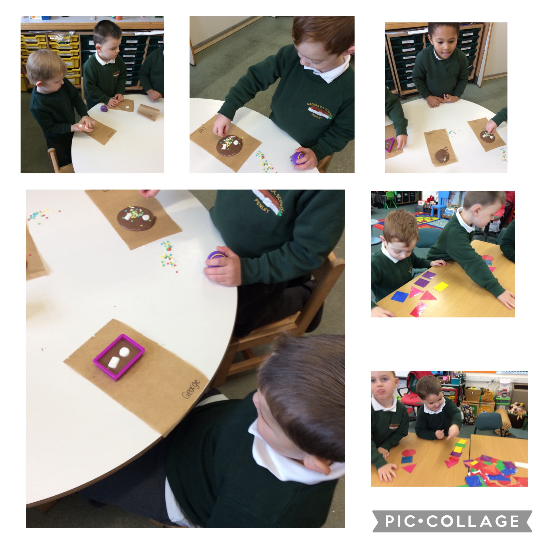 Nursery: Shapes Mon, 24th Nov 2025 Nursery: Shapes We are continuing our work on shape in Nursery. We made pictures from 2D shapes and looked at 3D shapes. We had lots of fun making shape lollies with icing shapes on top.