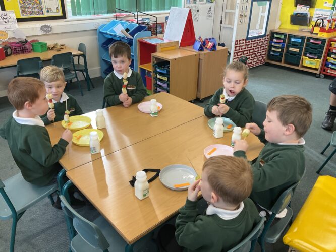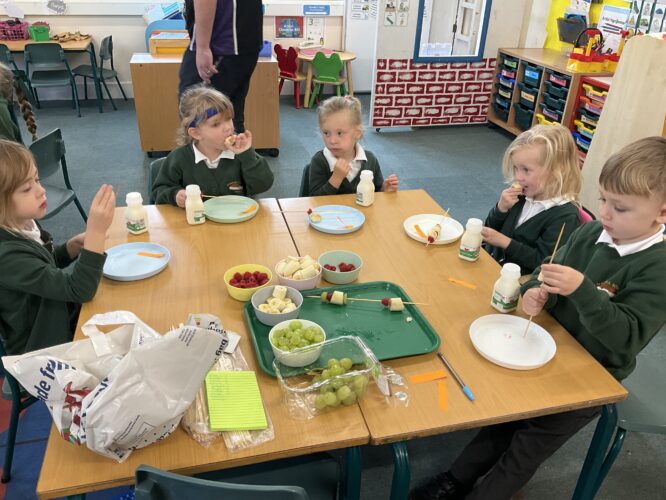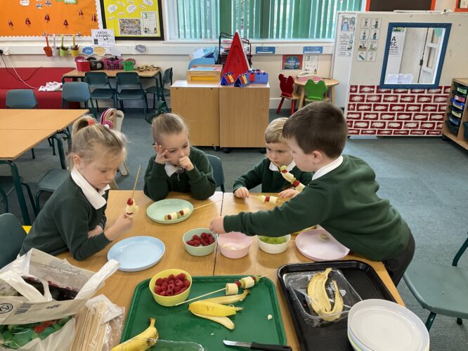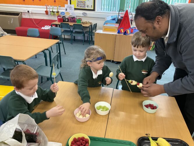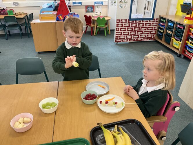 Reception: Fruit Kebabs and Patterns Thu, 13th Nov 2025This week we have been looking at patterns. We made fruit kebabs with patterns and had them as our snack, they were very yummy. We also found different things in the class we can make patterns out of.